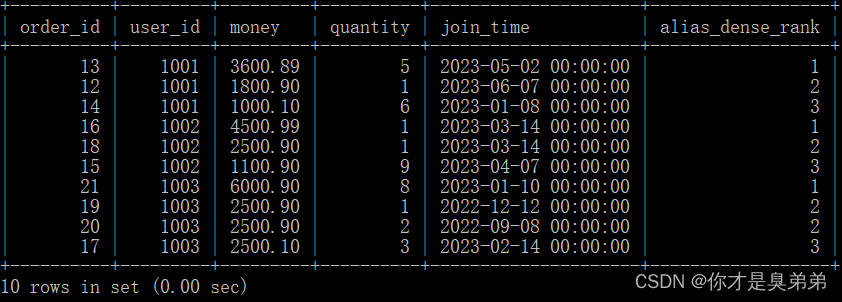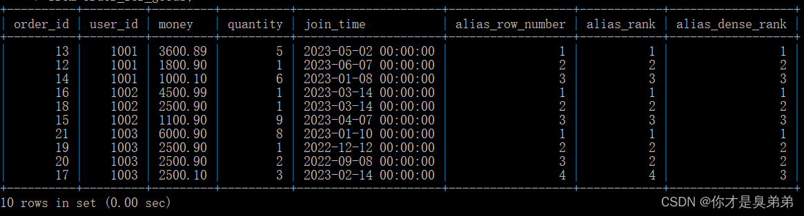 select *, row_number() over(partition by user_id order by money desc) as alias_row_number, rank() over(partition by user_id order by money desc) as alias_rank, dense_rank() over(partition by user_id order by money desc) as alias_dense_rankfrom order_for_goods; 從 order_for_goods 表中選擇了所有的列,并計算了每個用戶在每個訂單中的總金額,以及計算了每個用戶在每個訂單中的序號、排名和稠密排名。這個查詢使用了 row_number()、rank() 和 dense_rank() 函數來計算每個分區內的行的序號、排名和稠密排名。這些函數后面跟著 over() 子句,用于指定計算的窗口。在這個例子中,窗口是按照 user_id 分區,按照 money 列的降序排列的。2、執行結果