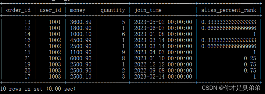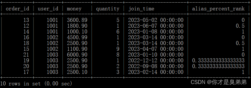 select *,percent_rank() over(partition by user_id order by money desc) as alias_percent_rankfrom order_for_goods; 從 order_for_goods 表中選擇了所有的列,并計算了每個用戶在每個訂單中的總金額,以及計算了每個用戶在每個訂單中的百分比排名。這個查詢使用了 percent_rank() 函數來計算每個分區內的行的百分比排名。這個函數后面跟著 over() 子句,用于指定計算的窗口。在這個例子中,窗口是按照 user_id 分區,按照 money 列的降序排列的。2、執行結果