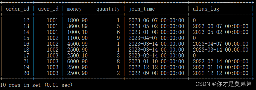 select *,lag(join_time, 1, 0) over(partition by user_id order by join_time desc) as alias_lagfrom order_for_goods;3、執行結果