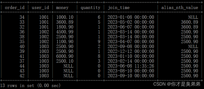 select *, nth_value(money, 2) over(partition by user_id order by join_time ) as alias_nth_valuefrom order_for_goods;注意,如果某個用戶在指定時間范圍內沒有數據,則 NTH_VALUE()函數將返回默認值 NULL。