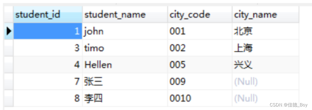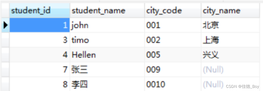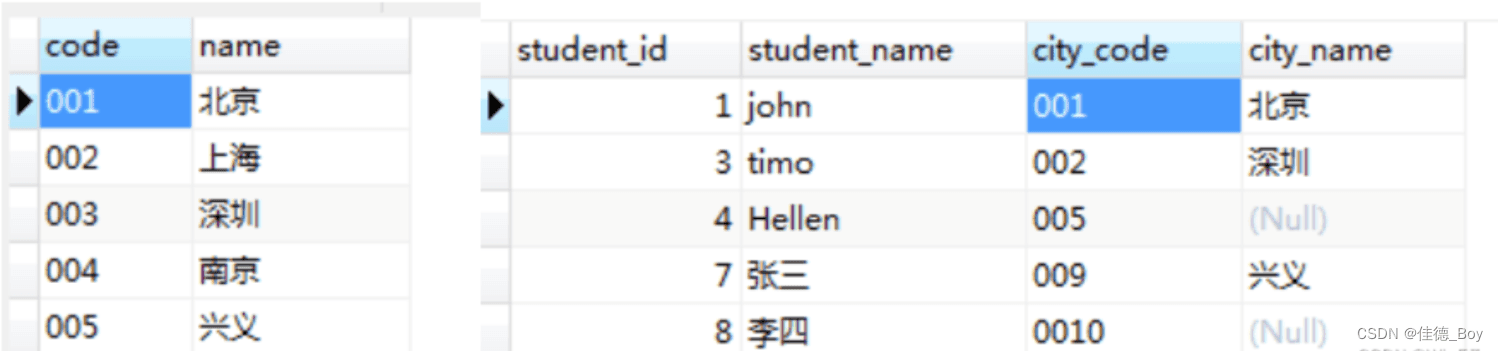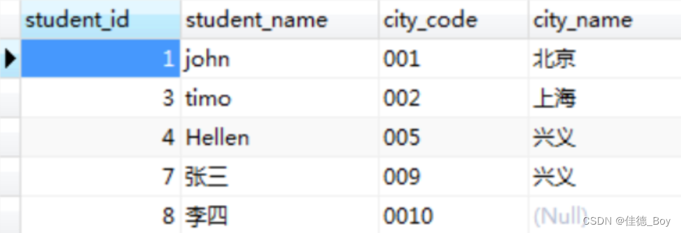 代碼對應(yīng)的城市更新,對應(yīng)錯誤的更正;city表中沒有的城市,在people表里全被更新為null。方法二:UPDATE people LEFT JOIN city ON people.city_code=city.`code` SET people.city_name=city.`name`;結(jié)果: