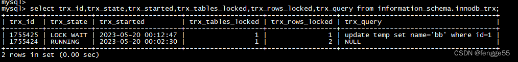mysql> select trx_id,trx_state,trx_started,trx_tables_locked,trx_rows_locked,trx_query from information_schema.innodb_trx;
