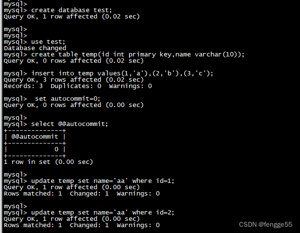 2.登錄打開第二個sessionmysql> set autocommit=0;Query OK, 0 rows affected (0.00 sec)mysql> mysql> select @@autocommit;+--------------+| @@autocommit |+--------------+| 0 |+--------------+1 row in set (0.00 sec)mysql> use testmysql> update temp set name='bb' where id=1; #執行這條sql,會一直卡住。4.登錄MySQL,打開第三個session。