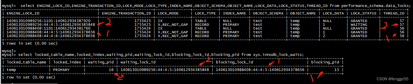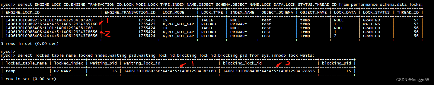 mysql> select ENGINE_LOCK_ID,ENGINE_TRANSACTION_ID,LOCK_MODE,LOCK_TYPE,INDEX_NAME,OBJECT_SCHEMA,OBJECT_NAME,LOCK_DATA,LOCK_STATUS,THREAD_ID from performance_schema.data_locks;mysql> select locked_table_name,locked_index,waiting_pid,waiting_lock_id,blocking_lock_id,blocking_pid from sys.innodb_lock_waits;
