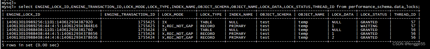 mysql> select ENGINE_LOCK_ID,ENGINE_TRANSACTION_ID,LOCK_MODE,LOCK_TYPE,INDEX_NAME,OBJECT_SCHEMA,OBJECT_NAME,LOCK_DATA,LOCK_STATUS,THREAD_ID from performance_schema.data_locks;