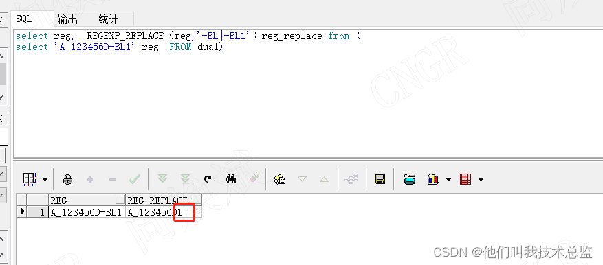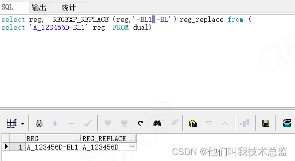 select reg, REGEXP_REPLACE(reg,'-BL|-BL1')reg_replace from (select 'A_123456D-BL1' reg FROM dual)效果:
