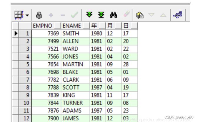 ----查詢出emp表中所有員工入職距離現在幾天。select sysdate-e.hiredate from emp e; 結果:以天為單位的小數----算出明天此刻select sysdate+1 from dual; 結果:2020/12/4 16:35:36----查詢出emp表中所有員工入職距離現在幾月。select months_between(sysdate,e.hiredate) from emp e; 結果:以月為單位的小數----查詢出emp表中所有員工入職距離現在幾年。select months_between(sysdate,e.hiredate)/12 from emp e; 結果:以年為單位的小數----查詢出emp表中所有員工入職距離現在幾周。select round((sysdate-e.hiredate)/7) from emp e; 結果:以周為單位的小數4、轉換函數4.1日期轉字符串:to_char()---日期轉字符串select to_char(sysdate, 'yyyy-mm-dd hh:mi:ss') from dual;結果:2020-12-04 05:18:03 12小時有0select to_char(sysdate, 'fm yyyy-mm-dd hh:mi:ss') from dual; 結果:2020-12-4 5:18:32 12小時無0select to_char(sysdate, 'fm yyyy-mm-dd hh24:mi:ss') from dual; 結果: 2020-12-4 17:18:47 24小時無0可以使用 TO_CHAR 函數來拆分年月日select empno,ename to_char(hiredate,'yyyy') 年, to_char(hiredate,'mm') 月, to_char(hiredate,'dd') 日from emp;