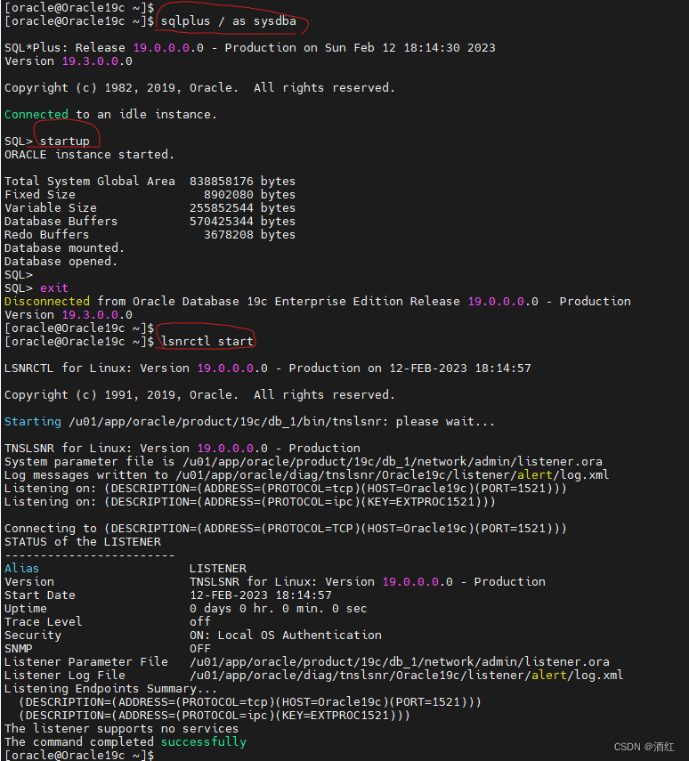 lsnrctl start [listener-name]: 啟動所有的監聽器,可以指定名字來啟動特定的監聽器。lsnrctl stop [listener-name]:關閉所有的監聽器,可以指定名字來關閉特定的監聽器。lsnrctl status:檢查當前監聽器的狀態。lsnrctl services:列舉監聽器的服務信息。lsnrctl reload:重新讀取listener.ora文件。lsnrctl help:可以顯示所有可用的監聽器命令。數據庫啟停命令shutdown immediate:數據庫關閉命令startup:數據庫啟動命令示例啟動數據庫,啟動監聽。