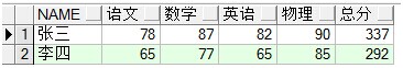 SELECT NAME,MAX(CASE WHEN COURSE='語(yǔ)文' THEN SCORE END) '語(yǔ)文',MAX(CASE WHEN COURSE='數(shù)學(xué)' THEN SCORE END) '數(shù)學(xué)',MAX(CASE WHEN COURSE='英語(yǔ)' THEN SCORE END) '英語(yǔ)',MAX(CASE WHEN COURSE='物理' THEN SCORE END) '物理',SUM(SCORE) '總分' FROM stu GROUP BY NAME;二、使用 Case When 實(shí)現(xiàn)行轉(zhuǎn)列(一行多列-->多行一列)2.1、實(shí)現(xiàn)效果①原表效果