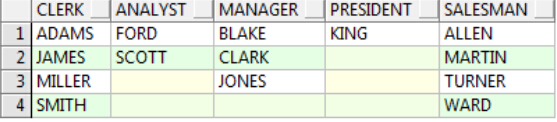 --將上面的結(jié)果轉(zhuǎn)為一行,可以使用 SUM 或者 COUNT 來求出。 SELECT SUM(CASE WHEN DEPTNO = 10 THEN 1 END) D_10,SUM(CASE WHEN DEPTNO = 20 THEN 1 END) D_20,SUM(CASE WHEN DEPTNO = 30 THEN 1 END) D_30 FROM EMP; --也可以使用下面的方法。 SELECT CASE WHEN DEPTNO = 10 THEN CN END D_10,CASE WHEN DEPTNO = 20 THEN CN END D_20,CASE WHEN DEPTNO = 30 THEN CN END D_30 FROM (SELECT DEPTNO, COUNT(1) CN FROM EMP GROUP BY DEPTNO); --和剛講的一樣,生成了三行三列數(shù)據(jù),使用 MAX 來獲取。 SELECT MAX(CASE WHEN DEPTNO = 10 THEN CN END) D_10,MAX(CASE WHEN DEPTNO = 20 THEN CN END) D_20,MAX(CASE WHEN DEPTNO = 30 THEN CN END) D_30 FROM (SELECT DEPTNO, COUNT(1) CN FROM EMP GROUP BY DEPTNO);四、將結(jié)果集轉(zhuǎn)為多行