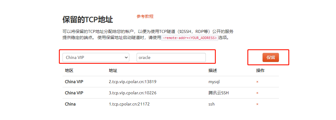 4.1 保留一個固定的公網TCP端口地址登錄 cpolar 官網,點擊左側的預留,選擇保留的 TCP 地址,我們先來為遠程 Oracle 保留一個固定端口地址。