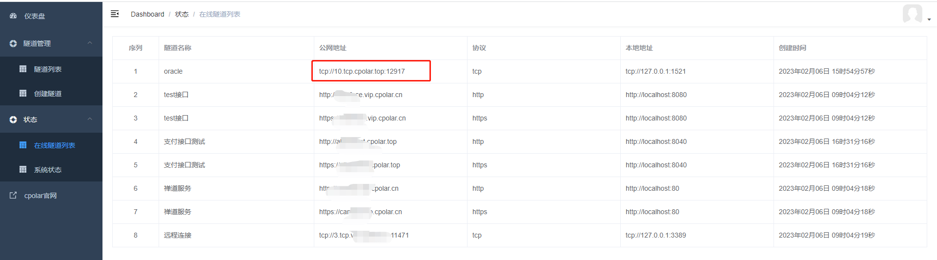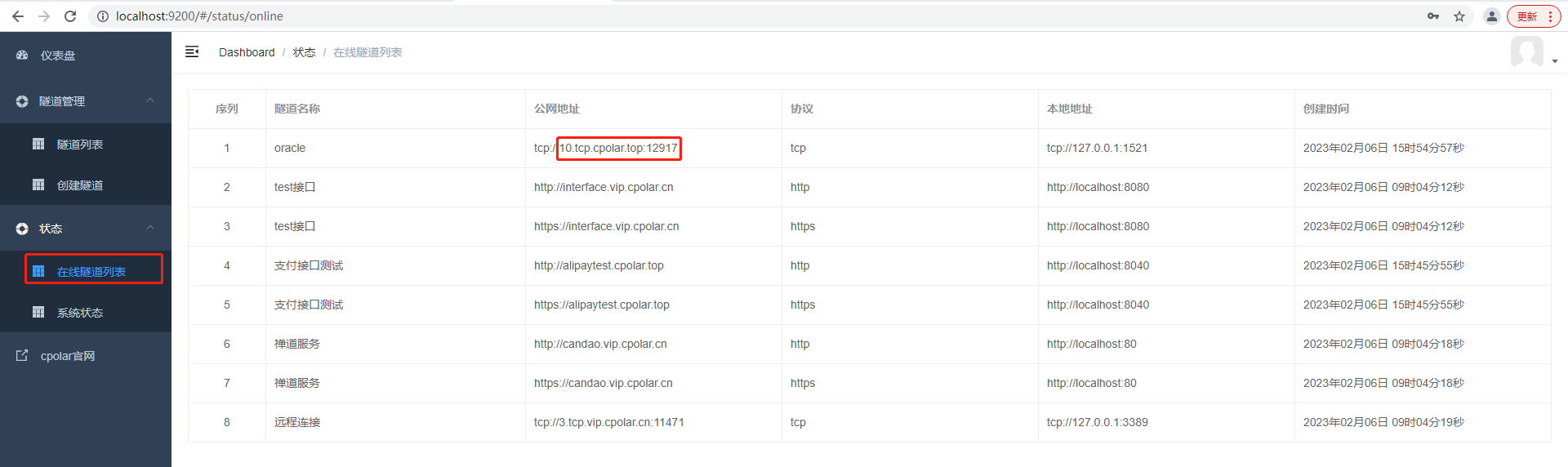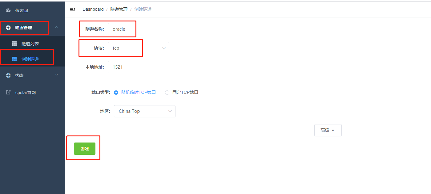登錄成功后,點擊左側儀表盤的隧道管理——創建隧道,創建一個tcp協議的隧道指向本地1521端口(oracle默認端口)