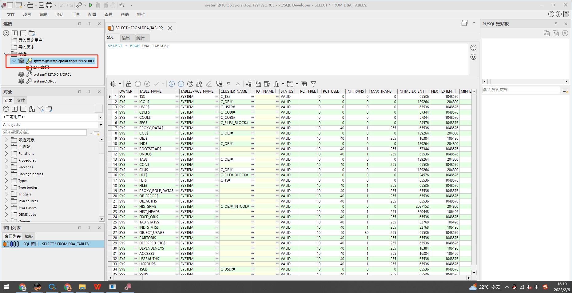 登錄后執行查詢系統表格select * from DBA_TABLES,出現數據表示連接成功