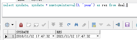 select sysdate, sysdate + numtoyminterval(3, 'year') as res from dual;結果: