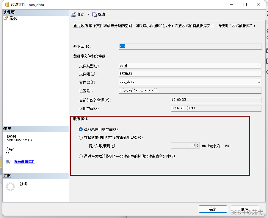 在收縮操作文件界面,在收縮操作中,可選擇釋放未使用空間、在釋放未使用空間前重新組織頁、通過將數(shù)據(jù)遷移到同一文件組中的其他文件來清空文件,三選一來進行手動收縮文件操作;