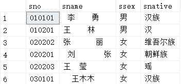 先有個一名為student的關系,其字段以及元組如圖所示: