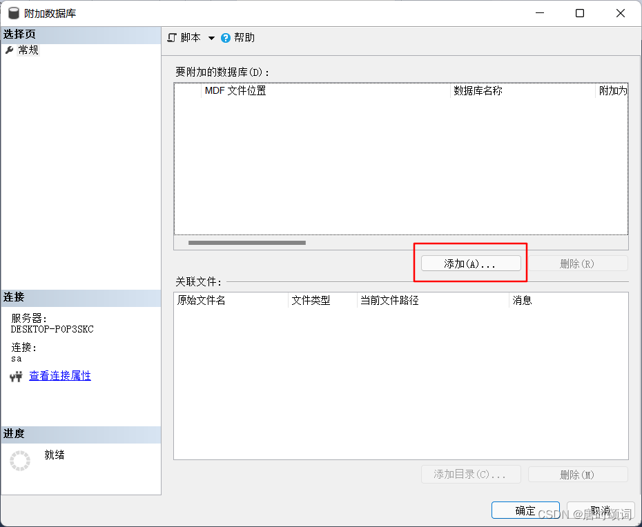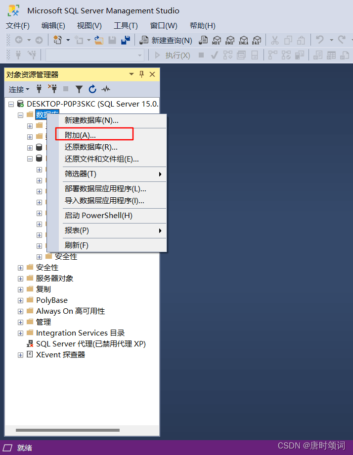 目錄一、sql server導入.mdf方法1.右擊數據庫,點擊附加2.點擊添加3.選擇文件,點擊確定4.添加成功!二、如果出現錯誤,處理方法總結一、sql server導入.mdf方法1.右擊數據庫,點擊附加