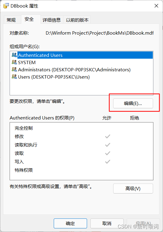 1.找到要添加的.mdf文件 —> 右擊 —> 屬性 —> 安全—>編輯