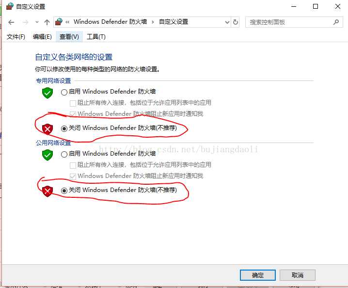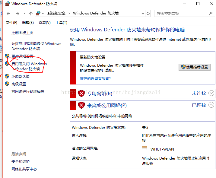 (4)如果數據庫連接仍然失敗,檢查防火墻。控制面板------->系統和安全------->Windows Defender防火墻------->允許應啟用或關閉Windows Defendddeer防火墻------->將Windows防火墻關閉。