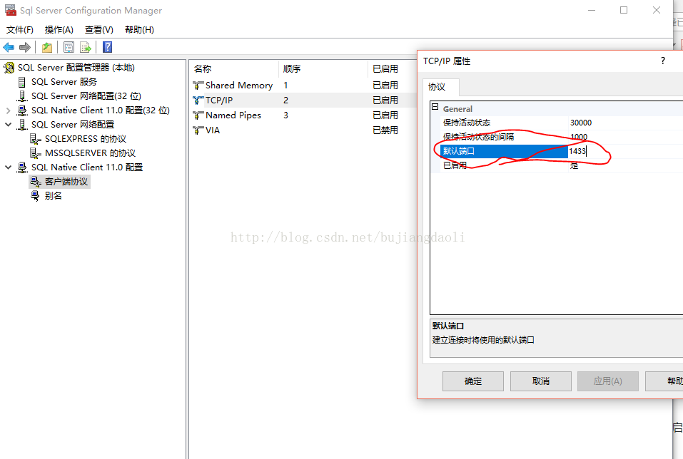 (2)打開SQLServer 配置管理器------->SQL Native Client 10.0 Configuration------->CP/IP------->如果沒有啟動,則啟動------->右鍵屬性------->將Default Port(默認端口)改為1433;