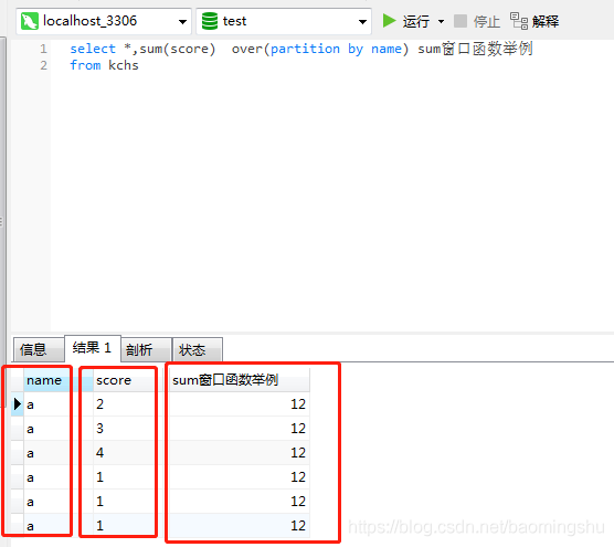 select *,sum(score) over(partition by name) sum窗口函數舉例from kchs-- 為了簡單就只有兩個字段,name和score