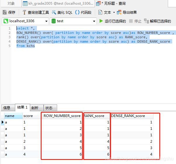 rank() over(partition by name order by score asc) as RANK_scoreDENSE_RANK()和RANK()類似,不同的是如果有相同的序號,那么接下來的序號不會間斷。例如:有三個人并列第一,第四名序號為2(111234)
