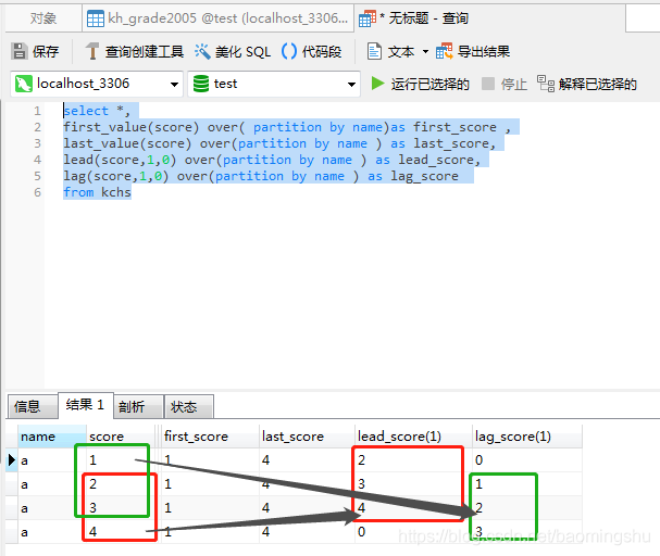 last_value(score) over(partition by name) as last_score--根據name分區(組),取score列的最后一個值lead 是取當前行的上 N 條數據,并且可以設置默認值