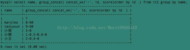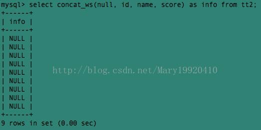 select concat (id, name, score) as info from tt2;#解釋:建立一個info的列,內容來自tt2表,內容為id,name,score連接的結果(有就連接 沒有就不連接 第七行為null 是因為tt2表中的score為null)