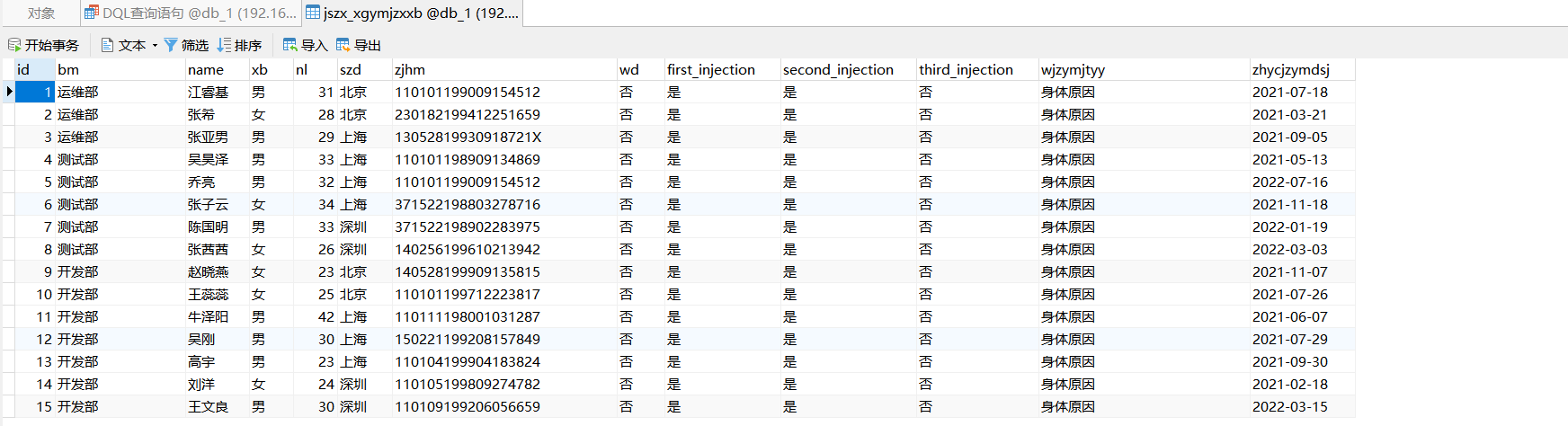 insert into jszx_xgymjzxxb (id, bm, name, xb, nl, szd, zjhm, wd, first_injection, second_injection, third_injection, wjzymjtyy, zhycjzymdsj) values ('15','開發部','王文良','男','30','深圳','110109199206056659','否','是','是','否','身體原因','2022-03-15');