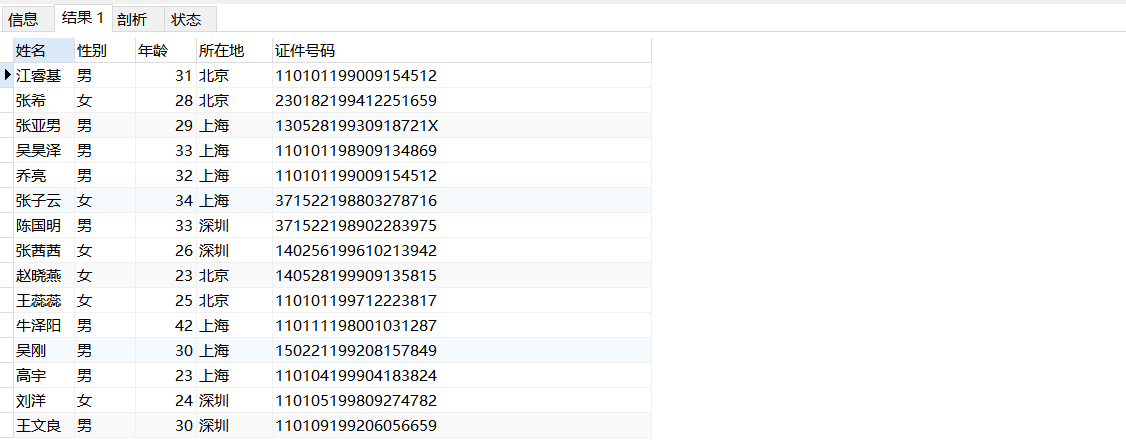 查詢表中name、xb、nl、szd、zjhm等五個字段的數據,并為每個字段設置別名。