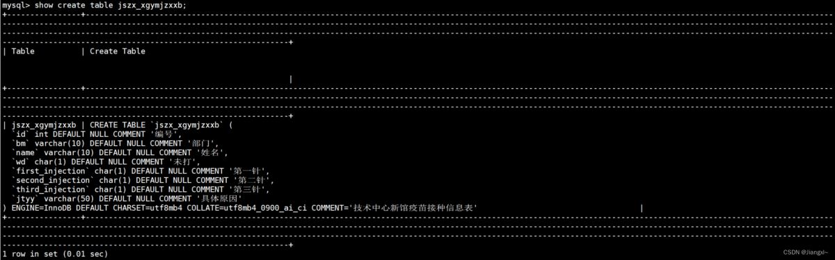 mysql> show create table jszx_xgymjzxxb;| Table | Create Table || jszx_xgymjzxxb | CREATE TABLE `jszx_xgymjzxxb` ( `id` int DEFAULT NULL COMMENT "編號", `bm` varchar(10) DEFAULT NULL COMMENT "部門", `name` varchar(10) DEFAULT NULL COMMENT "姓名", `wd` char(1) DEFAULT NULL COMMENT "未打", `first_injection` char(1) DEFAULT NULL COMMENT "第一針", `second_injection` char(1) DEFAULT NULL COMMENT "第二針", `third_injection` char(1) DEFAULT NULL COMMENT "第三針", `jtyy` varchar(50) DEFAULT NULL COMMENT "具體原因") ENGINE=InnoDB DEFAULT CHARSET=utf8mb4 COLLATE=utf8mb4_0900_ai_ci COMMENT="技術(shù)中心新館疫苗接種信息表"