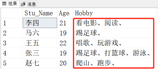 SELECTT.Stu_Name,T.Age,LEFT(T.Hobby,LEN(T.Hobby)-1) AS HobbyFROM(SELECTA.Stu_Name,A.Age,(SELECT Hobby+"、"FROM [dbo].Stu_HobbyWHERE--必須加的匹配條件Stu_Name=A.Stu_Name AND Age=A.AgeFOR XML PATH("")) AS HobbyFROM [dbo].Stu_Hobby AGROUP BY A.Stu_Name,A.Age) T結果如下:
