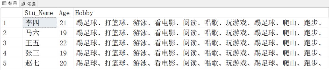 CREATE TABLE Stu_Hobby(Stu_Name NVARCHAR(20),--姓名Age INT,--年齡Hobby NVARCHAR(20) --愛好)INSERT INTO Stu_HobbyVALUES ( N"張三",19,N"踢足球"), ( N"張三",19,N"打籃球"), ( N"張三",19,N"游泳"), ( N"李四",21,N"看電影"), ( N"李四",21,N"閱讀"), ( N"王五",22,N"唱歌"), ( N"王五",22,N"玩游戲"), ( N"馬六",19,N"踢足球"), ( N"趙七",20,N"爬山"), ( N"趙七",20,N"跑步")