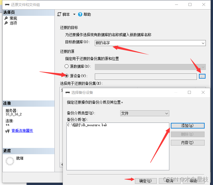 然后設置目標數據庫的名字,如果數據庫中已經存在相同名字的,則需要修改或者刪除原來同名的數據庫,然后在選擇源設備,點擊右邊的。。。點擊彈出框中的添加,找到要備份文件的位置,點擊確定。