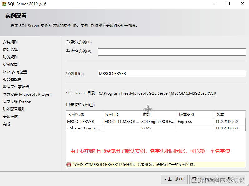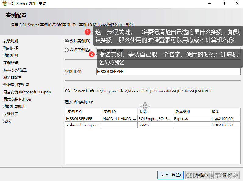 第八步:實例名的選擇,通常使用默認實例名,有的也會使用命名實例名,此處的選擇非常重要,關系到你后面是否成功登錄數據庫管理工具。