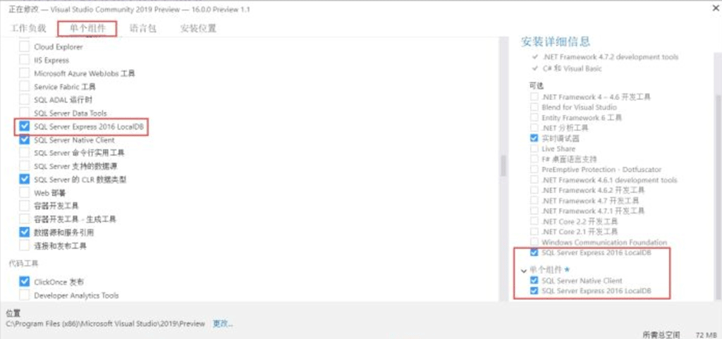 如果選了.NET負載,直接在里面勾上就行;如果沒有,選到單個組件,勾上localdb,會自動勾上下一項那個依賴。