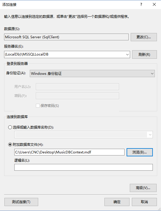 然后附加一個名稱為MusicDBContext.mdf的數據庫文件(文件可以自己定義)并點擊確定,此時,MusicDBContext.數據庫作為默認的數據庫,我們可以選擇SQLLocalDB中的其他已有數據庫。