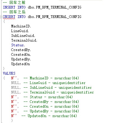 -- 按下‘Tab"鍵 之前SELECT * FROM dbo.MM_LOT_OPERATIONS_DAY -- 按下‘Tab"鍵 之后 SELECT PK, Day, SerialNumber, NamePlate, MasterSerialNumber, OrderID, DefID, StepID, StationID, MachineID, PassCount, SnStatus, EventBy, EventDatetime, UpdatedBy, UpdatedOn FROM dbo.MM_LOT_OPERATIONS_DAY