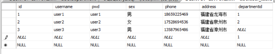 select user_table.id,user_table.username,user_table.sex,user_table.phone,user_table.address,department.dname from user_table inner join department on user_table.departmentid=department.did;