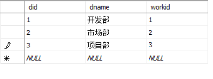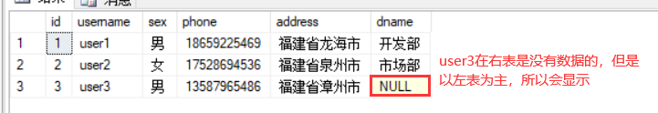 select user_table.id,user_table.username,user_table.sex,user_table.phone,user_table.address,department.dname from user_table left join department on user_table.departmentid=department.did;