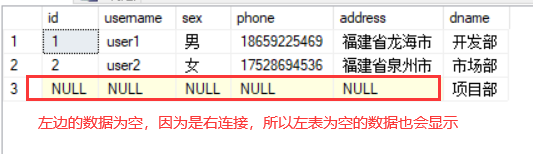 select user_table.id,user_table.username,user_table.sex,user_table.phone,user_table.address,department.dname from user_table right join department on user_table.departmentid=department.did;