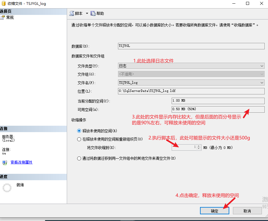 Sql Server 日志 _log.ldf文件太大,數據庫文件有500g,日志文件也達到了500g,占用磁盤空間過大,且可能影響程序性能,需要壓縮日志文件。