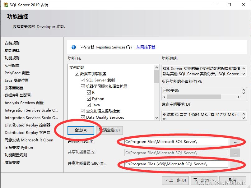 然后選擇需要安裝的功能(通常情況選擇全選按鈕,機(jī)器學(xué)習(xí)服務(wù)和語(yǔ)言拓展可不選),選擇安裝路徑(根據(jù)自己需求更改即可),完成后點(diǎn)擊下一步: