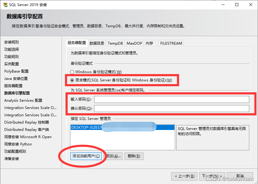 選擇混合模式,點(diǎn)擊添加當(dāng)前用戶,為超級(jí)管理員(sa)設(shè)置密碼(記住自己設(shè)置的密碼):