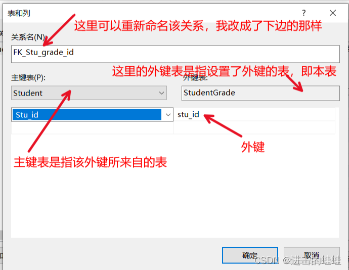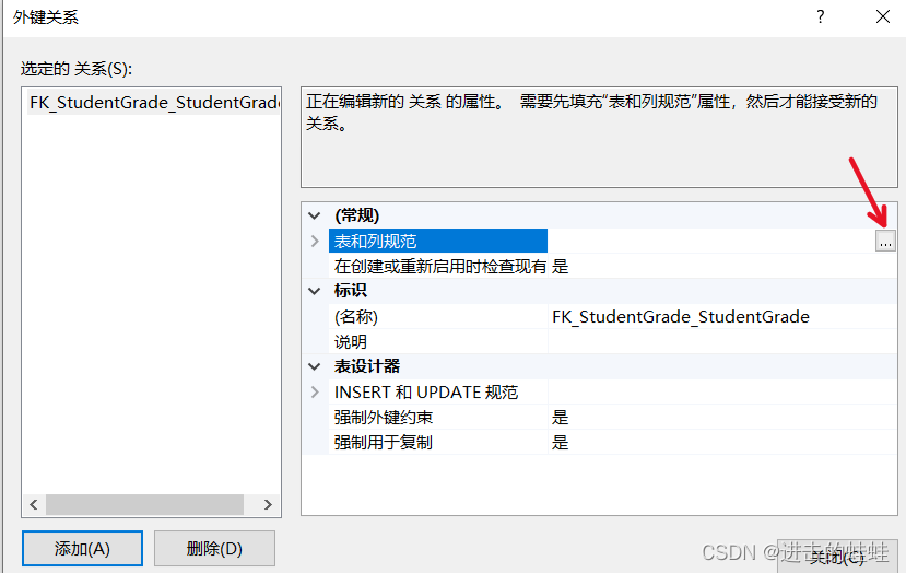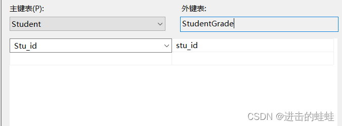 (假設(shè)正在設(shè)置的這張StudentGrade表稱為本表,其他表相對地稱為外表),我認(rèn)為外鍵表應(yīng)該是指外鍵本來所在的表,即外表,因此應(yīng)該設(shè)置為Student才對,但是這個框框一直編輯不了;而主鍵表應(yīng)該指我正在編輯的這張StudentGrade表才對,但是當(dāng)選擇StudentGrade之后,下面列選項的框框就變成空的,沒有列可選。