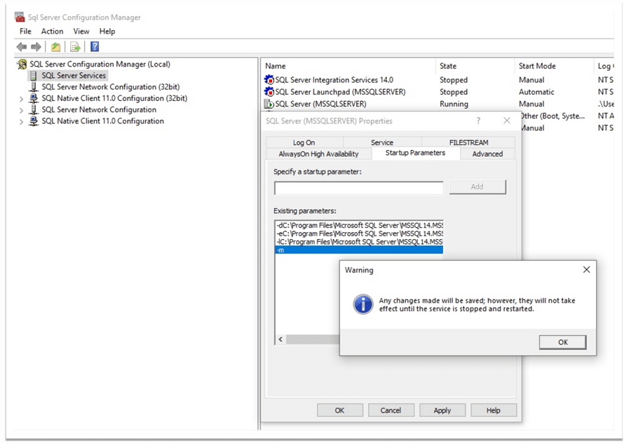 為此,請(qǐng)打開(kāi)“SQL Server 配置管理器”,選擇“SQL Server 服務(wù)”,然后選擇相應(yīng)的 SQL Server 實(shí)例,右鍵單擊它并選擇“啟動(dòng)參數(shù)”。作為啟動(dòng)參數(shù),我們指定“-m”,表示服務(wù)將以單用戶模式啟動(dòng)。