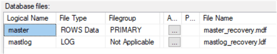 restore database master_recovery from disk = "c:\master.bak" withmove "master" to "C:\Program Files\Microsoft SQL Server\MSSQL13.MSSQLSERVER\MSSQL\DATA\master_recovery.mdf",move "mastlog" to "C:\Program Files\Microsoft SQL Server\MSSQL13.MSSQLSERVER\MSSQL\DATA\mastlog_recovery.ldf";