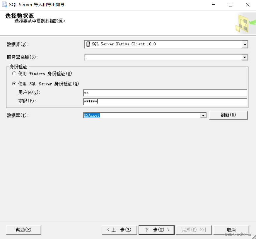 2.在打開的SQL Server導入和導出的向導中,選擇服務器名稱.代表本機,身份驗證使用SQL Server身份驗證,輸入用戶名,密碼,選擇數據庫,單擊下一步