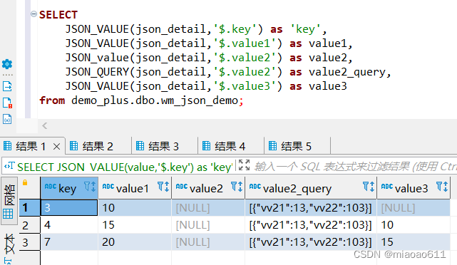 INSERT INTO demo_plus.dbo.wm_json_demo (json_detail) VALUES("{"key":3,"value1":10,"value2":[{"vv21":13,"vv22":103}],"value3":null}");INSERT INTO demo_plus.dbo.wm_json_demo (json_detail) VALUES("{"key":4,"value1":15,"value2":[{"vv21":13,"vv22":103}],"value3":"10"}");INSERT INTO demo_plus.dbo.wm_json_demo (json_detail) VALUES("{"key":7,"value1":20,"value2":[{"vv21":13,"vv22":103}],"value3":"15"}");IsJson:判斷一個字符串是不是合法的Json格式。是返回1,否返回0,null返回null。