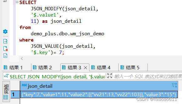 SELECT JSON_MODIFY(json_detail, "$.value1", 11) as json_detailfrom demo_plus.dbo.wm_json_demowhere JSON_VALUE(json_detail, "$.key")= 7;